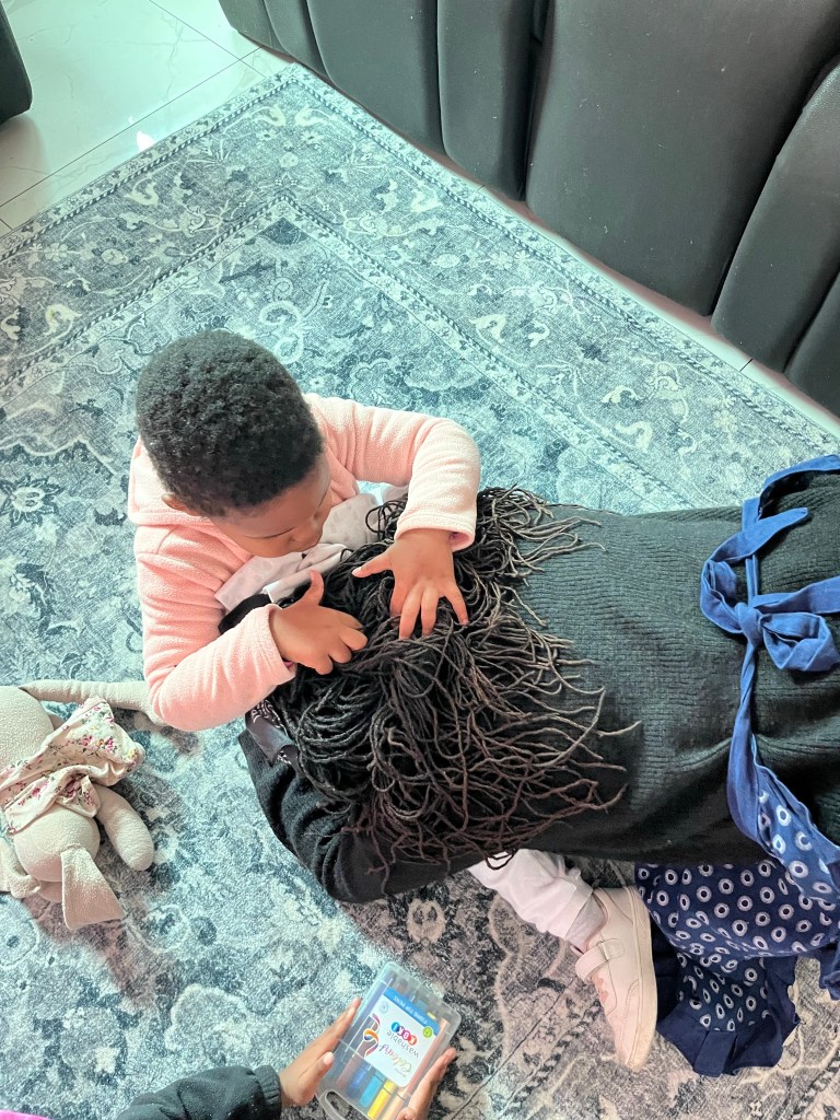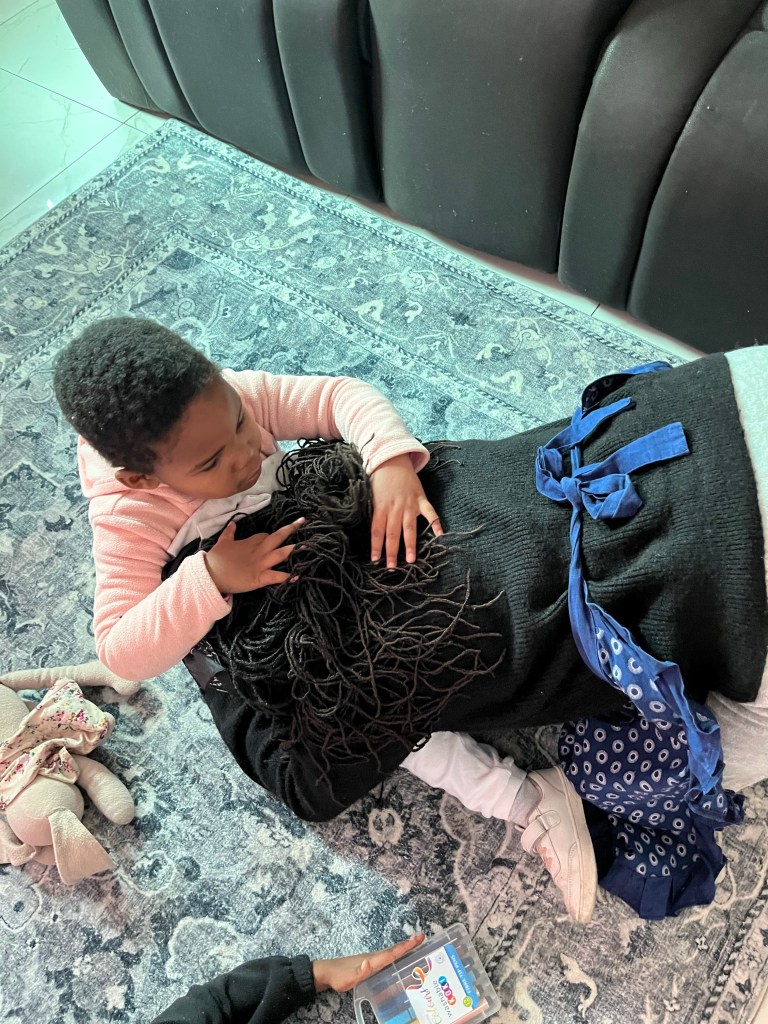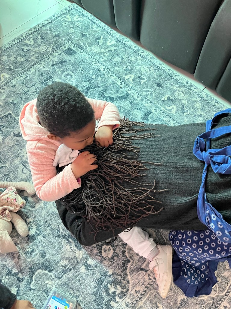 Hugs…Not really. Not always. But this? Yes always. My hair is her happy place. And so I bend my body to give her a bit of comfort and love. She rests on me, leans into me, and relaxes.