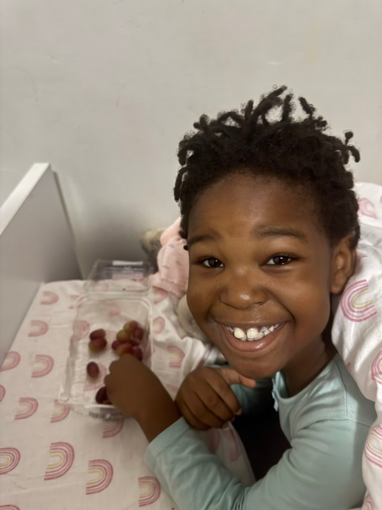 Guess who came to my room at 1:30 wanting grapes. These girls are definitely aging me even faster than my diseases are! I took multiple pain pills after a horrible hospital visit. I slept at 1:17am. Then she came in.😆