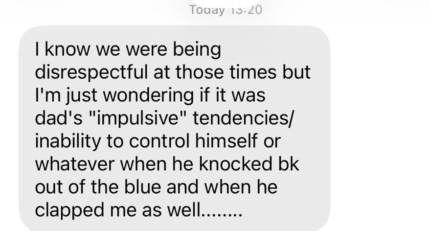 Each time, I told him he had damaged my children. This was how he was raised by his mommy who he worships. All his siblings and he himself attest to how cruel she was. He’s told me multiple times of the weapons she used on them. I heard her myself beating her 19 year old (The one she had with her married lover. It runs in the family. Evil and adultery. All of them. Father included) when I lived with them in the UK. And then she’s surprised she had to call the police once when he then grabbed her by the neck to stop her?