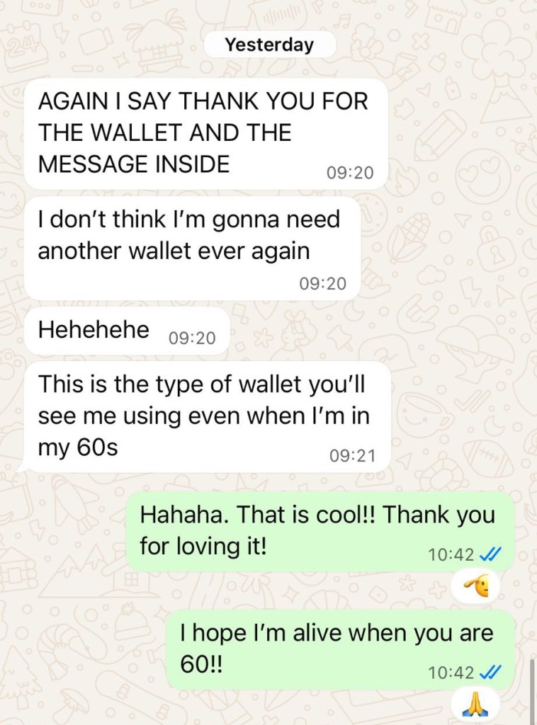 I was not prepared for how he immediately emptied his old wallet and transferred everything into THIS one. That meant the world to me! And a day later, I found out exactly how much it meant to him to.