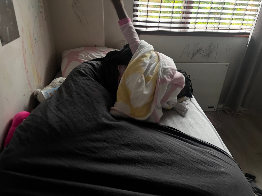 This girl MUST have restless feet syndrome. She never ends up in the morning, the way she has been put to sleep! Her duvets and comforters are always diagonal, or falling off, or like today, rolled around her shoulders!